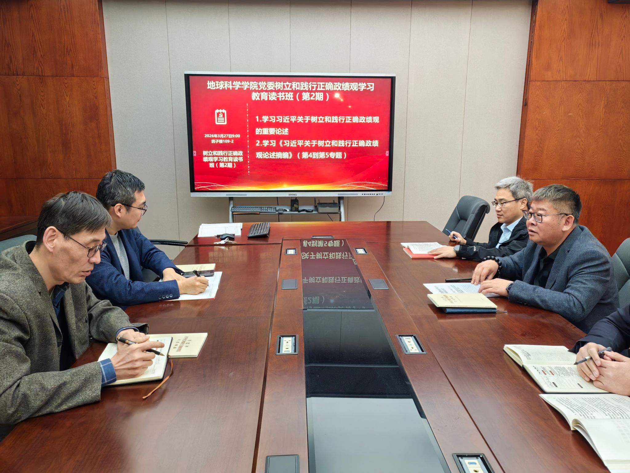 3月27日,地球科学学院在鸽子楼109-2会议室举办树立和践行正确政绩观学习教育读书班(第期),学院领导班子成员参加会议会议由党委书记衣长涛主持。